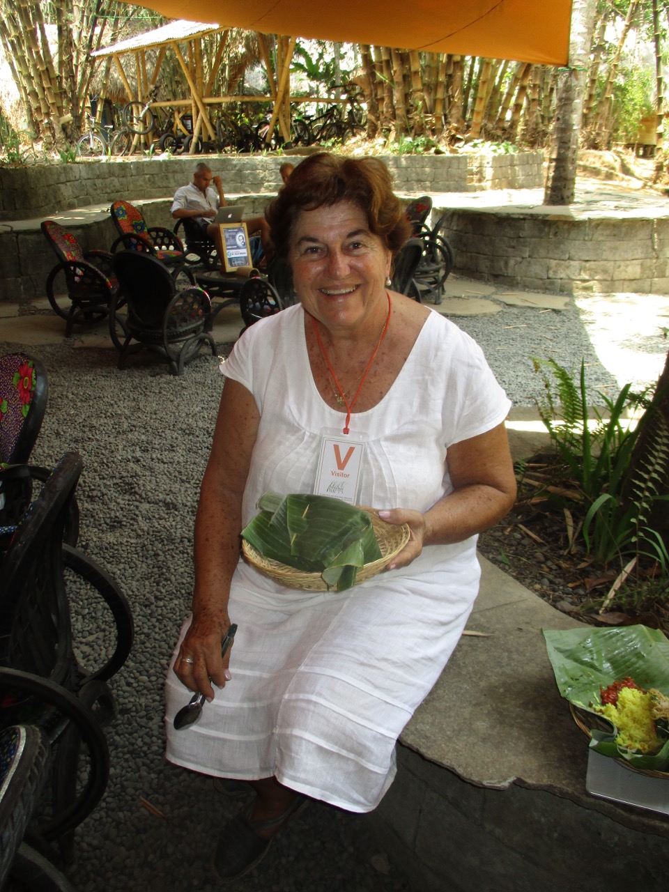 Abuelita enjoys her first Indonesian meal in a banana leaf “bowl”